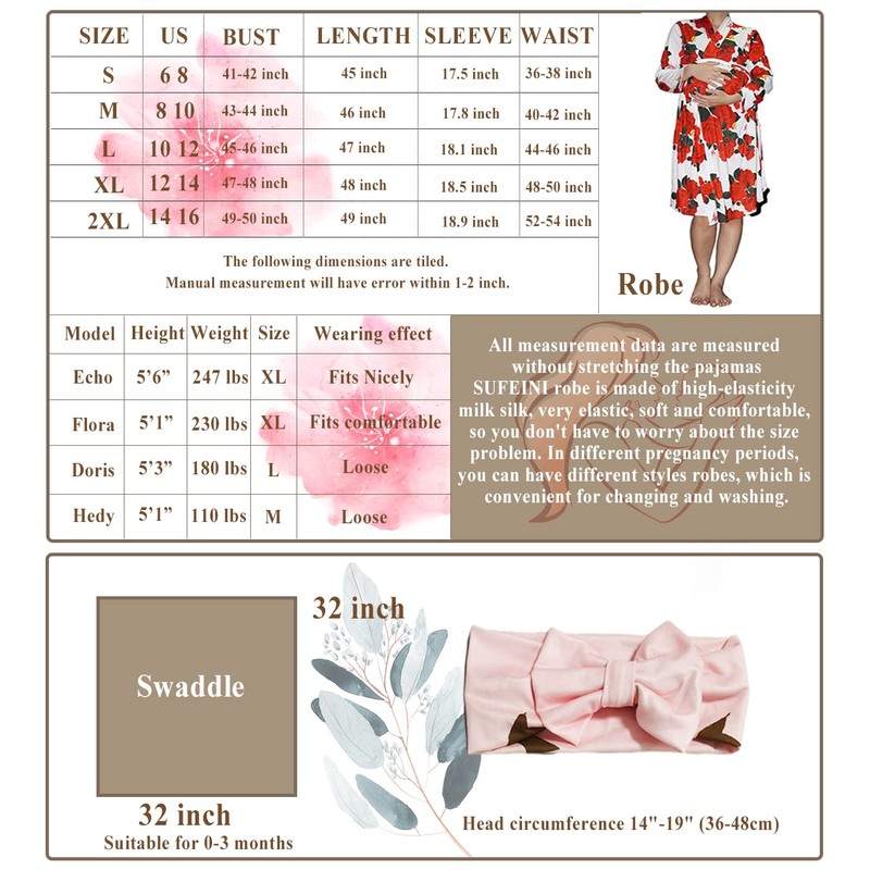 - ❤️Soft Mommy Robe and Swaddle Set -SUFEINI maternity robe are available in 5 sizes. The receiving blanket is one size, 32inch * 32inch, headband are suitable for head circumference 14"-19" (36-48cm) .SUFEINI nursing robe and matching swaddle set Included-1 x Maternity Robe,1 x Swaddle Blanket,1 x Headband.