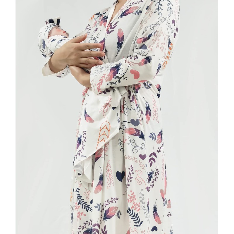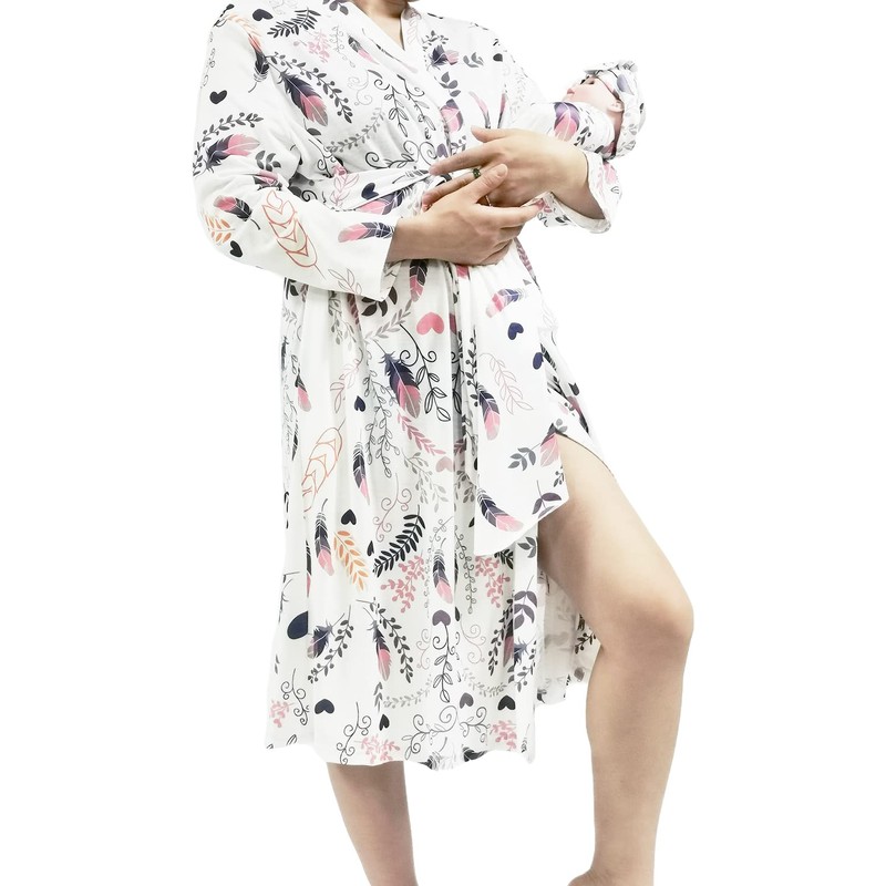 - ❤️Maternity Robe for Hospital & Designed for Mom-to-be - Birth robe for hospital with matching swaddle.Postpartum robes for hospital, the material is very stretchy so you never feel confined by it. Belt sewn into the back of the robe for added comfort & convenience. Mommy me matching robe and swaddle set features a comfortable and stretchy design that accommodates a growing belly.