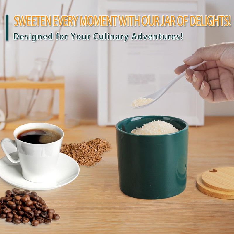 - Convenient design: Our ceramic condiment jar includes a practical lid and matching spoon for effortless scooping. The lid's convenient opening allows quick access to sweeteners or condiments, simplifying your daily routine whether it's for morning coffee or afternoon tea.