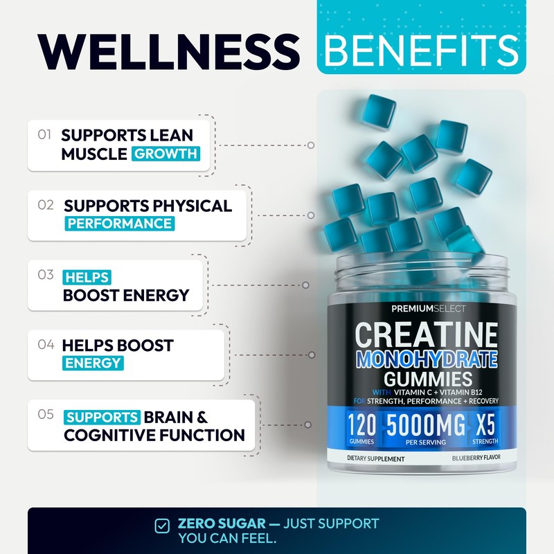 Sugar Free Creatine Monohydrate Gummies 5g Per Serving - 120 Monohydrate Creatine Gummies Advanced Complex with Vitamin C + Vitamin B12 for Muscle Strength, Energy Boost, Pre-Workout Gummy