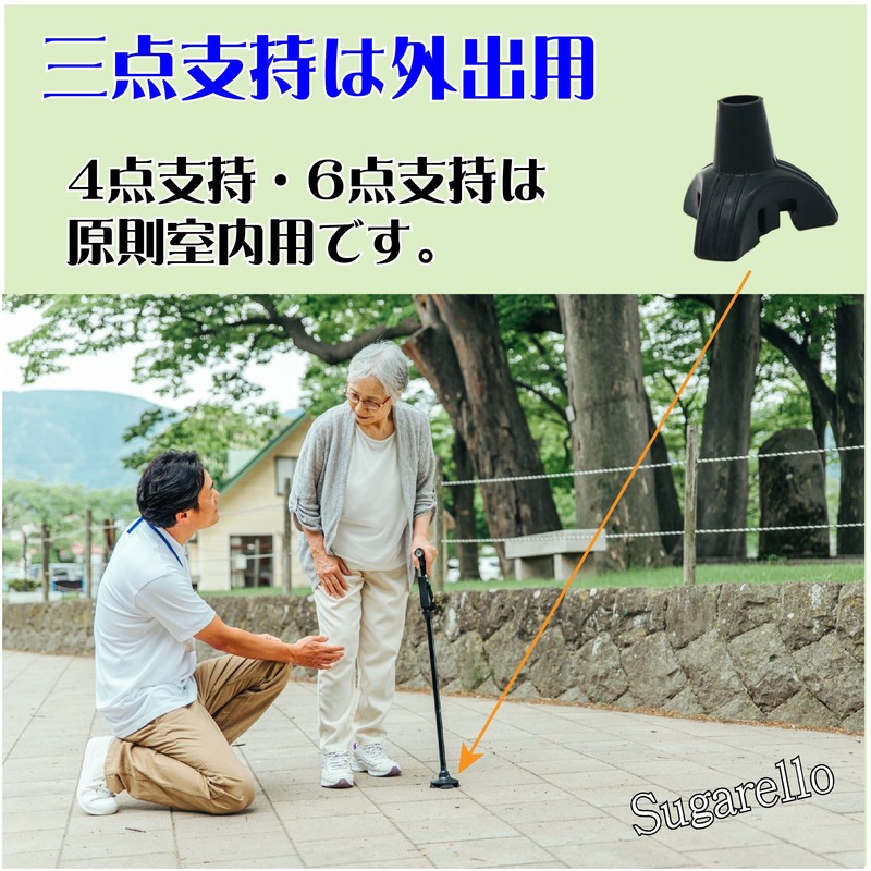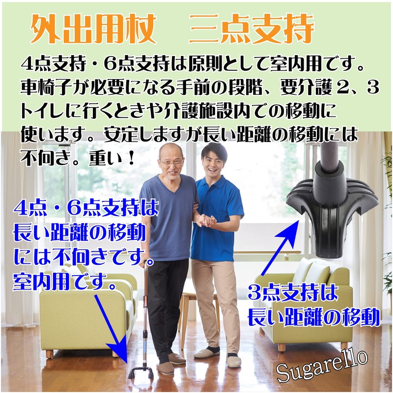 - 【外出には3点支持がお勧め】通常の杖は垂直方向の力には安定しますが、斜めに力がかかった場合は不安定になり滑ることがあります。体力が衰えた場合は転倒などによりケガをする恐れがあります。そこでグリップ力に優れた多点支持杖を使用することになります。要介護認定を受けておられる方は介護保険からの給付もできますが、主に4点支持、6点支持の杖になります。外出用、散歩用ではなく、主に介護施設や室内で、例えばトイレに行くときなど短い距離の移動に使います。そこまで体力が衰えていないけど、1点支持では不安な方、杖をついて50m以上歩く方は軽量タイプの3点支持がお勧めです。