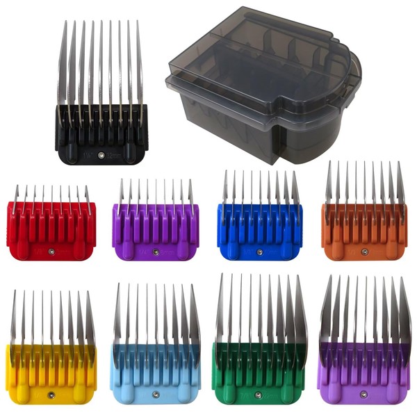 • Package Included: Set of 9 stainless steel guide combs for pet grooming and a storage box .