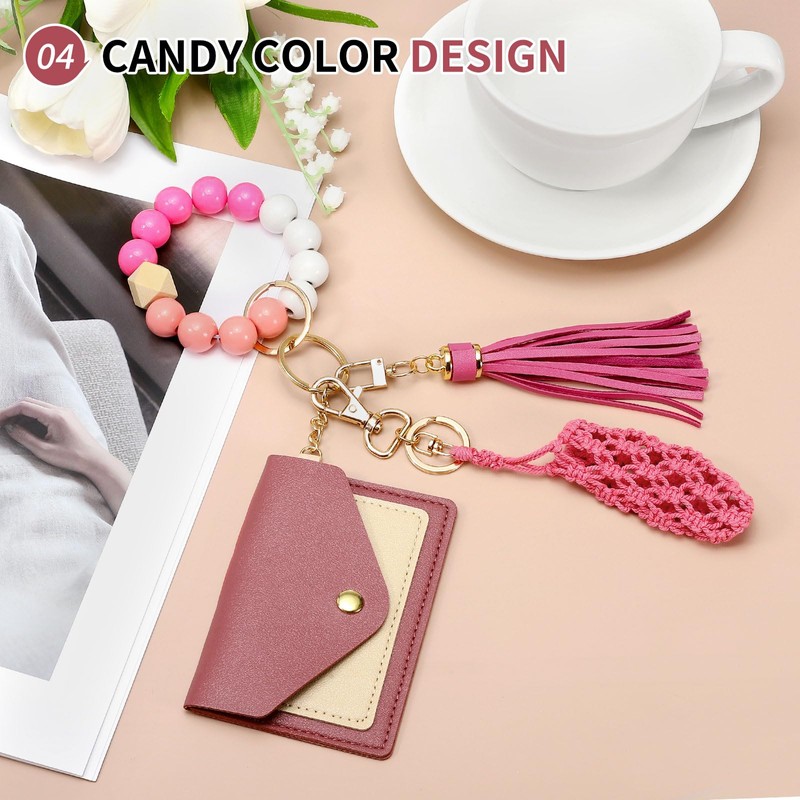SUIKIHUM Small Credit Card Wallet with Keychain Wristlet Silicone Beads Ring and Net Lip Balm Holder, PU Leather Card Holder for Women, Rose