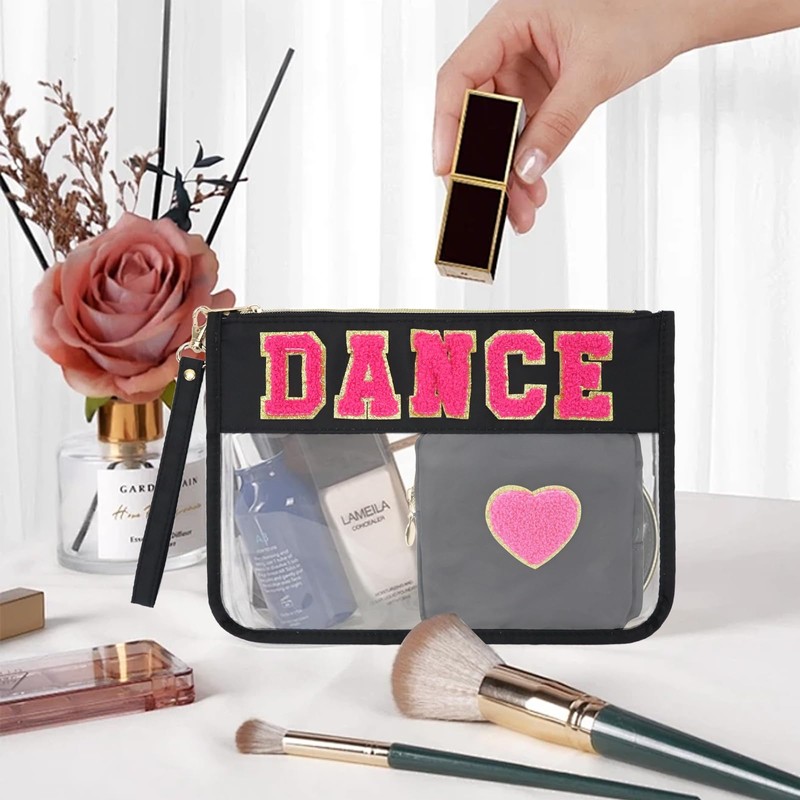 SUILU 2 Pcs Dance Recital Gifts Cosmetic Makeup Bag with Chenille Letter Patch,with Handles PVC Waterproof Clear Makeup Bag,Portable Toiletry Storage Bag