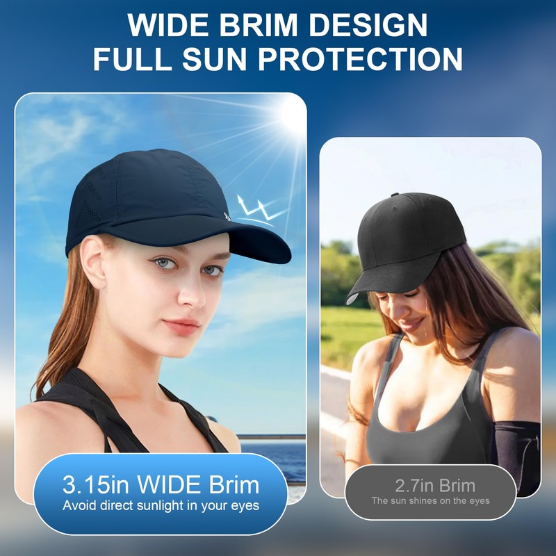 - 8 cm extended brim design. Compared to 7 cm normal brim, Sukeen baseball cap 8 cm longer brim design is optimised and updated for a larger sun protection area. It can cover the entire eye area without worrying about the glare of the sun and prevent UV rays from damaging your eyes.