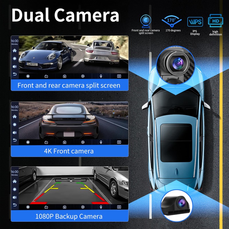 - Carplay with 4K+1080P Front and rear Dash Cam:Equipped with a 4K front camera and a 1080P rear camera, this system offers ultra-high-definition recording, allowing you to capture your driving experience clearly in any circumstance. The newest front HDR lens allows you to capture clear photos even in dazzling sunlight.The adjustable front camera enables recording at an angle of up to 170 degrees, and its retractable design adds convenience for your use.(Tips: 64G TF card is included)