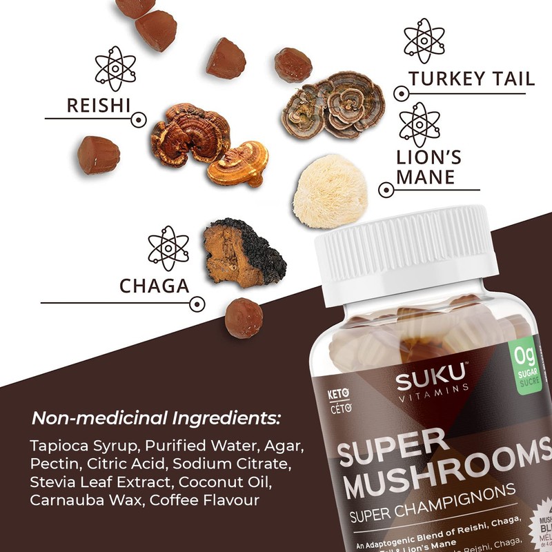 - EASY TO TAKE NUTRIENTS- No more drips and spills with SUKU Vitamins’ SUPER MUSHROOMS gummies! Enjoy the convenience and goodness of our keto-friendly chewable gummy vitamins. Take 2 gummies per day