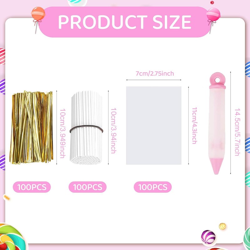 - VALUE PACKAGE: you will receive 302pcs cake pop maker kit. Includes 1pcs cake pop scoop, 1pcs decorating pen with Four-headed,100pcs lollipop bags, 100pcs papery treat sticks and 100pcs metallic twist ties. Our cake pop accessories is also very friendly for beginners. Cake pop can be made without a oven.