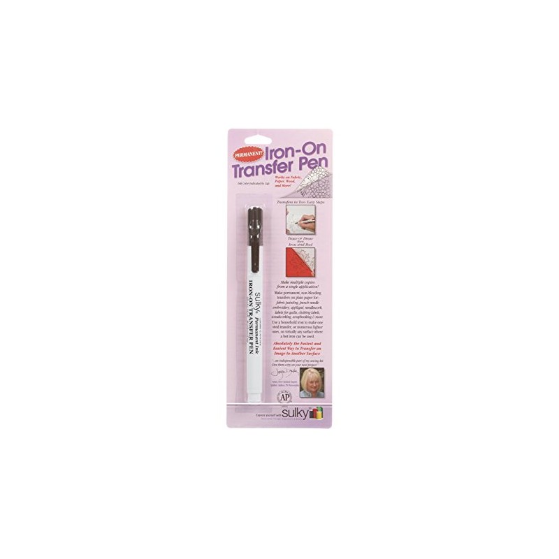 SULKY-Iron-On Transfer Pen. Here is a Transfer Pen that easily transfers designs permanently onto fabric; canvas; stabilizers; wood or just about any surface where a hot iron can be used. Perfect for all craft enthusiasts at all skill levels. This package contains one Permanent; Non-bleeding pen with Ink that glides on like a marker and can be transferred 3-5 times with one application. It is as easy as 1-2-3. Available in a variety of colors: each sold separately. Made in USA.