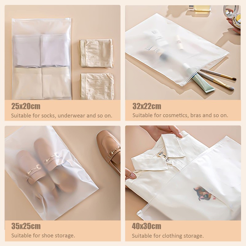 - 5 Different Mixed Sizes --- 5 different sizes, 20pcs frosted reusable plastic ziplock travel storage clothes bag. 30*40cm, 25*35cm, 20*25cm, 17*25cm, 32*22cm (4pcs per size). Meet different storage needs. Classify and tidy different size items.