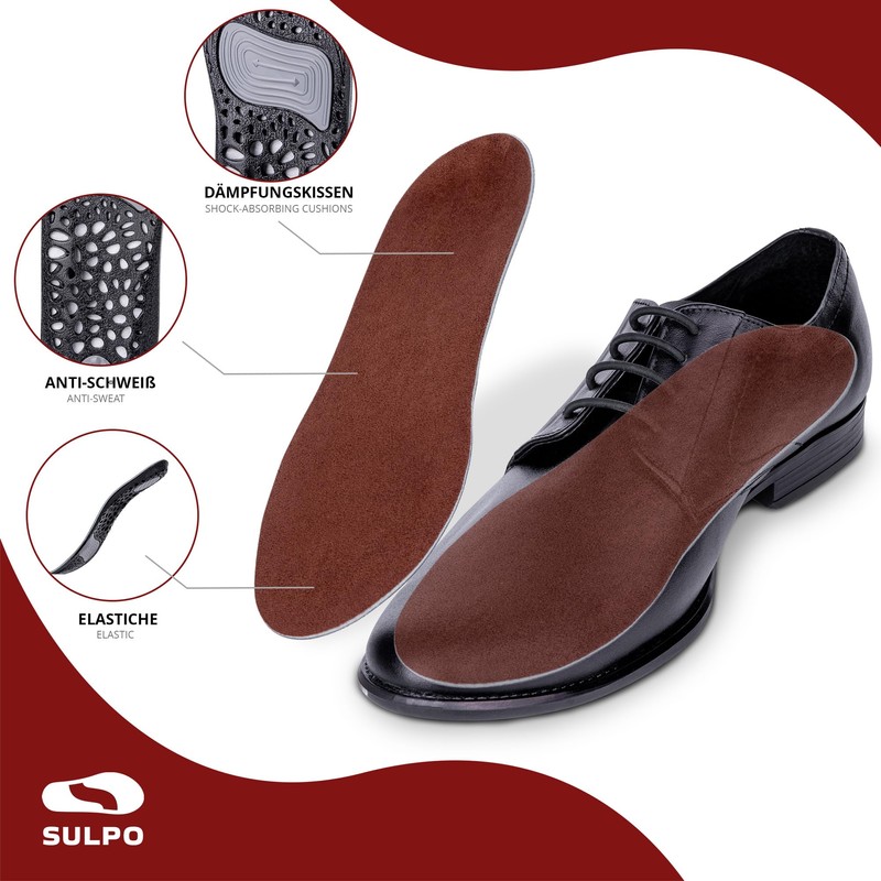 - SULPO Quality and ease to wear – these special shoe insoles are very elegant. The bottom of the insole is gel, while the top is velour. Feel light, elegant and comfortable at the same time. With these special shoe insoles, this is possible and very easy.