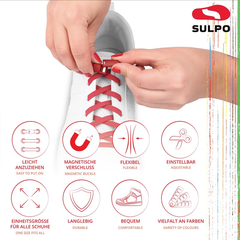 - Improved design: we at SULPO know our laces like hardly any other. We've listened to your reviews and have a brand new shoelace model for you, with a new colorful magnetic closure that won't slip and is easy to attach.