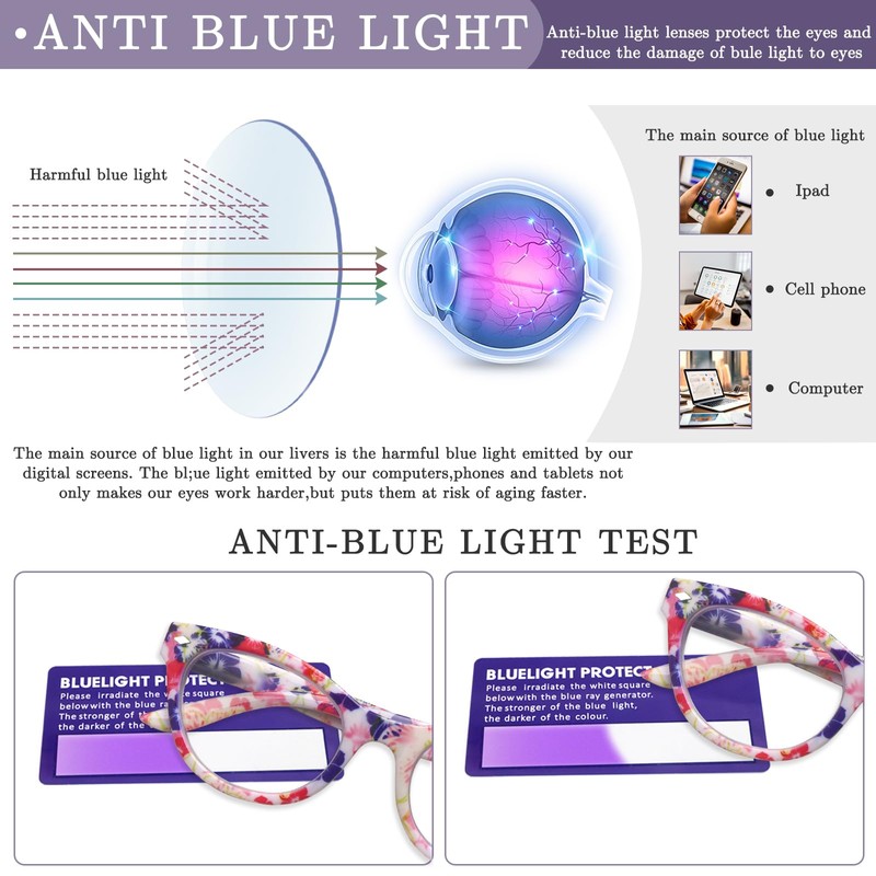 - BLUE LIGHT BLOCKING CAT EYE READING GLASSES FOR WOMEN-- Blue light blocker with UV400 protection, help you resist harmful blu-ray , alleviates visual fatigue and discomfort from browsing mobile phones, tablets, gaming and working under fluorescent lights.Reduce glare, fatigue, headache,protect your vision and help sleep better.
