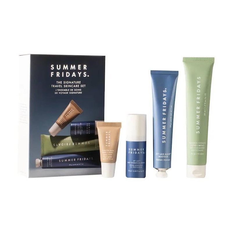 - This Set Contains: - 0.16 oz/ 5 g Lip Butter Balm in Vanilla - 0.33 oz/ 10 mL Jet Lag Deep Hydration Serum - 1 oz/ 28 g Jet Lag Mask - 1.7 oz/ 50 mL Summer Fridays Super Amino Gel Cleanser - 0.03 oz/ 1 mL Jet Lag Overnight Eye Serum Packette