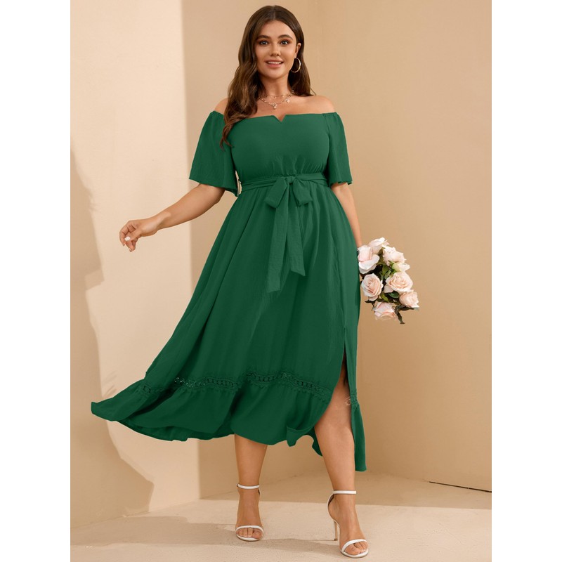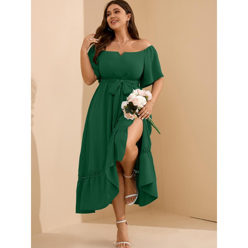 Summer Maxi Dress, Women's Green Formal Dress for Cocktail Wedding Guest Evening Party V Neck Off The Shoulder Boho Lace Trim Dresses with Belt 2X-Large
