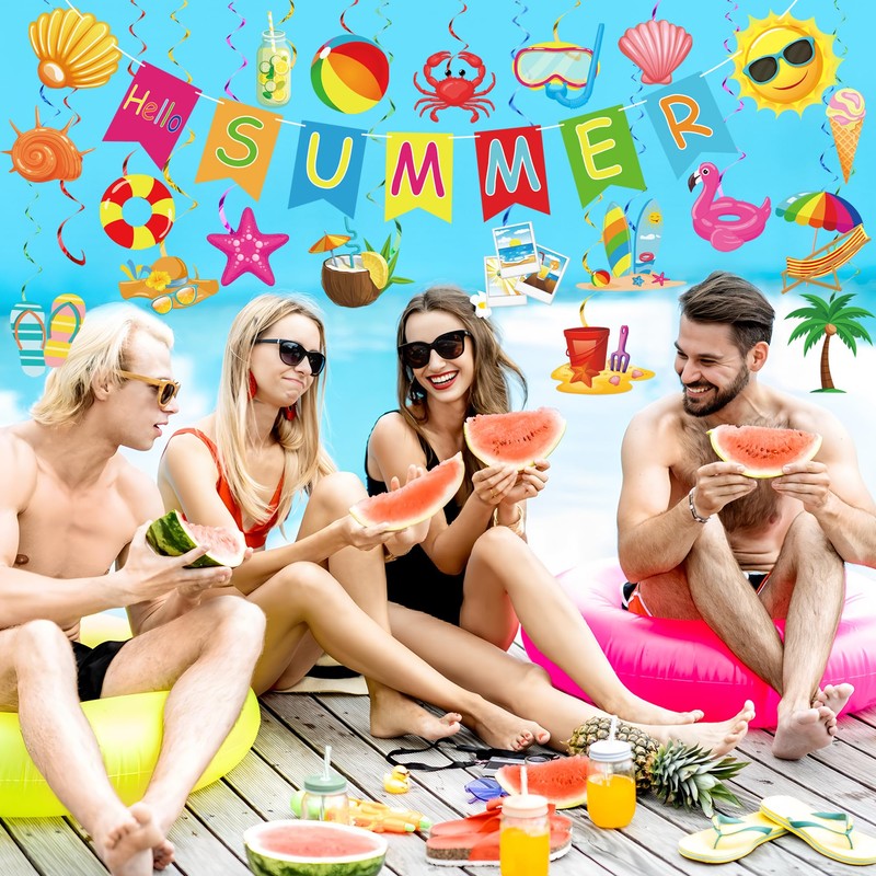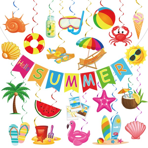 - What you will get: the summer party decorations set includes 1pcs hello summer banner and 19pcs summer theme hanging swirls decorations, total 28pcs beach hanging cards. This summer party decoration will bring you a relaxing and comfortable summer atmosphere.
