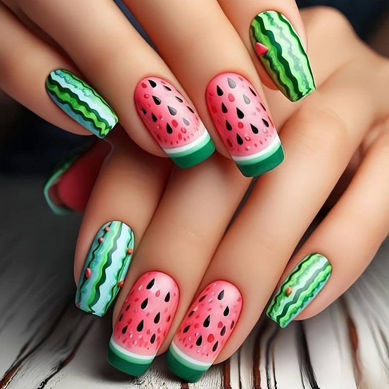 Summer Press on Nails Watermelon Stick on Nails Medium Square Fake Nails French Tip False Nails Fruit Glue on Nails Full Cover Acrylic Nails Glossy Artificial Nails Reusable Nails for Women Girl 24Pcs