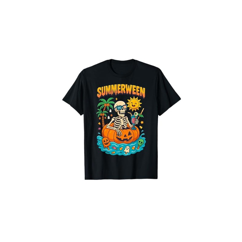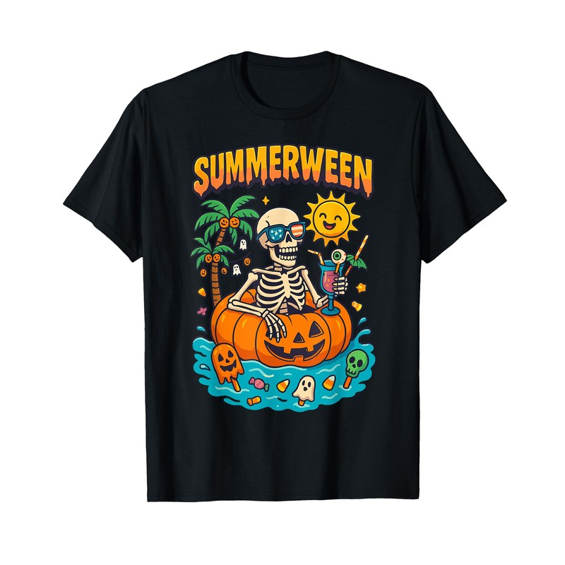 - Add a spooky twist to your summer style with this fun summerween skeleton design. A relaxed skeleton floats in a carved pumpkin surrounded by candy, waves, palm trees, and sunshine for a playful mix of Halloween and warm weather fun.
