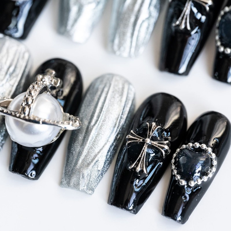 Sun&Beam Nails Handmade Nail Tip, Medium, Long, Ballerina, Black, Silver, Popular, 3D, Fashionable, Cute, Cool Design, False Claws, Includes Storage Box, Pack of 10 (#44 M)