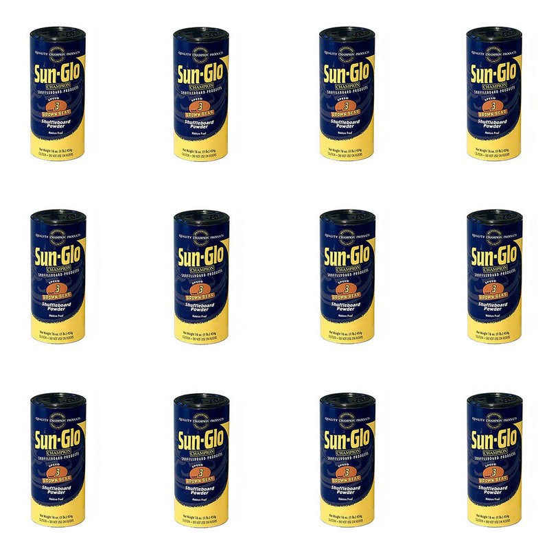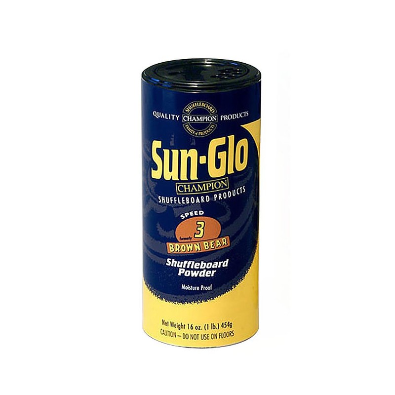 Speed 2 - Formerly Tournament Gold The shuffleboard powder (wax) is one of the most important elements of playing the game. Our newest powder, formulated for the serious player. Used in most tournament play and preferred by professionals. Use with the Sun-Glo cleaner and silicone spray to keep your game consistent and competitive, and your table clean. To clear away used powder consider bundling the # 2 Speed Tournament Gold Shuffleboard Powder Wax with the solid wood Shuffleboard Sweep. A must for a clean table. Picking a powder is easy. Sun-Glo manufactures a variety of powders that allows you to create the kind of game you prefer. Fast, Super Fast, or a little slower with more control - it's up to you. All Sun-Glo powders are tested for consistency and accuracy. Since 1935, Sun-Glo has been a product you can trust. Designed and tested by professionals. So if you want to experience an extremely FAST game, a game with the elements of professional play or a slower, more family- friendly game, find the powder that works for your style of play. Or order one of each and test your skill! The Sun-Glo Corporation was founded in 1935 in Belleville, NJ and quickly became a leader in the shuffleboard accessories industry. Founder Ed Decepoli, Sr. chose the name Sun-Glo because the sun's reflection could be seen so clearly on tables after his polish was applied. Today, based upon its quality line and its reputation in the industry, the Sun-Glo market continues to expand with new products engineered especially for Champion Shuffleboard tables and formulation updates for some of the original line of products.