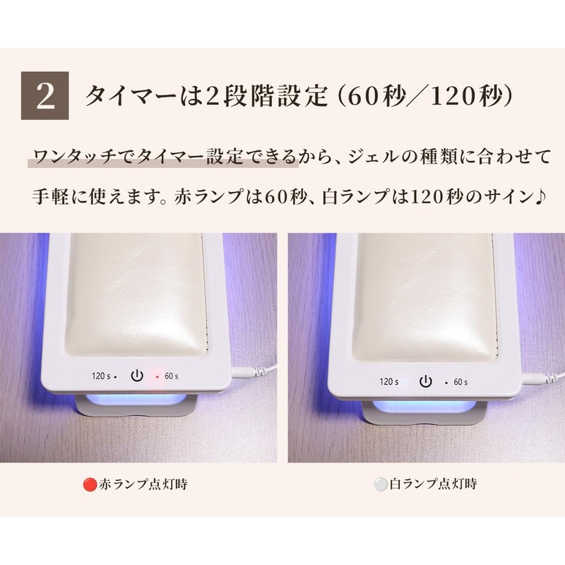 • Equipped with 2 timer settings for 60 and 120 seconds, you can switch the curing time with one touch. The red lamp is 60 seconds and the white lamp is signed by 120 seconds for beginners to use
