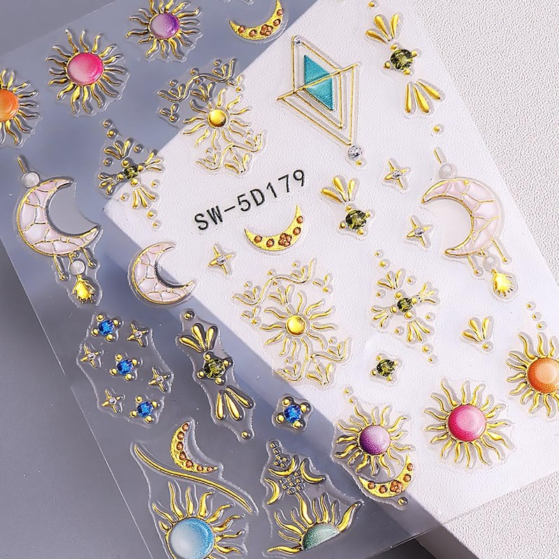 - 5D Nail Stickers: You will get 2 sheets of 5D star nail stickers. Has a wealth of patterns, such as sun, moon, star, and a variety of 5D Bohemia style patterns.