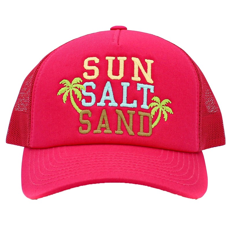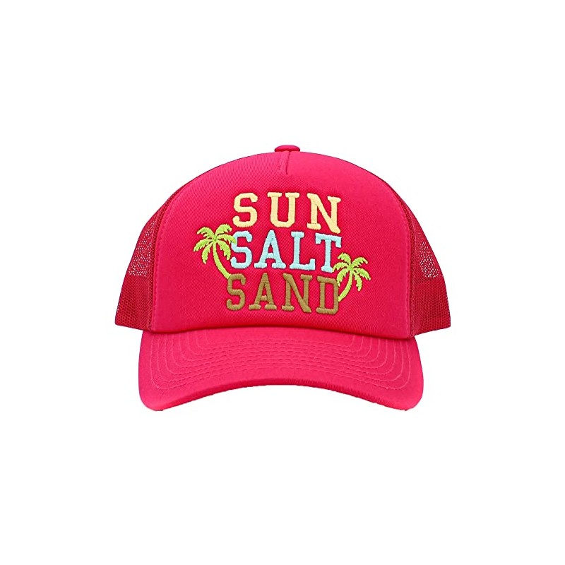 Ladies and big girls will love this trucker hat! Hat has a foam, flat brim, with a plastic mesh back. Back of hat has an adustable snapback. Embroidered on the front of the hat is 'SUN SALT SAND' with palm trees. The colorful embroidery is high quality! Perfect for the beach girl on vacation, vacay, or on a cruise. Perfect to wear during the summer on the salty water beaches or just to say BEACH PLEASE! This is a great weekend cap! Wear while tanning or sun bathing to shield the sun from your eyes. Wear while boating, kayaking or swimming! One size fits most.