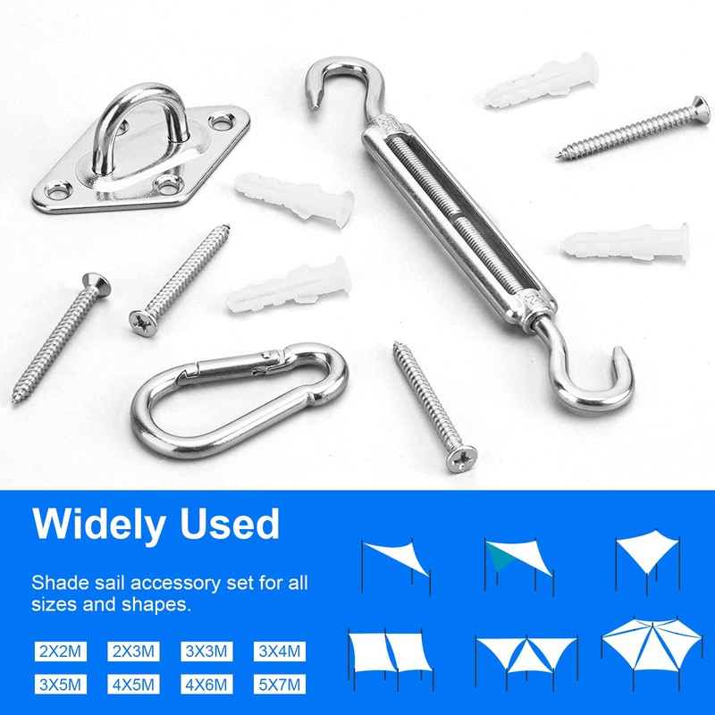 • sun shade hardware kit - Adjustable turnbuckle for shade sail x 4pcs, Pad eyes x 4pcs, Snap Hook x 4pcs, Phillips head helical spiral threads screw x 16pcs, Plastic expansion x 16pcs, rectangle Shade Sail Hardware Kit contains 44 pcs of well made components.
