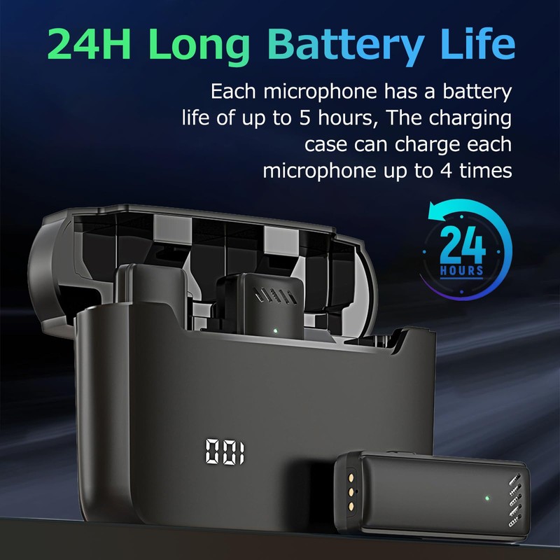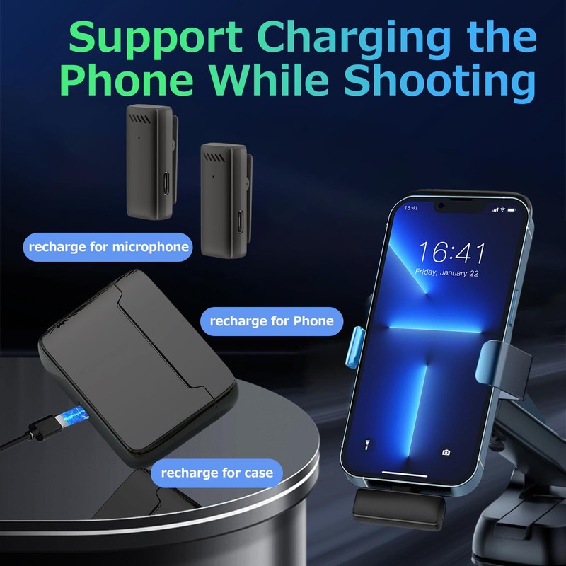 - 【No low batter anxiety 】The small wireless lavalier microphone is designed specifically for the phone and allows you can also charge the microphone with your mobile phone while using the mini microphone so there is no more battery anxiety during video recording. Besides, the receiver is designed with a USB type-C interface, and you can charge your cell phone while recording. Each microphone has a battery life of up to 5 hours, charging case can charge each microphone up to 4 times.