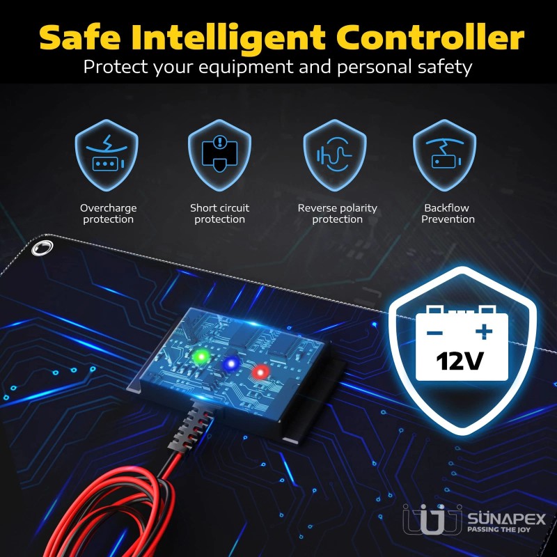 - No Overcharging, No Battery Drain: The solar panel includes a built-in controller that prevents overcharging. When the battery is full, the controller stops charging automatically and resumes when the voltage drops. Our solar panel system won’t drain your battery