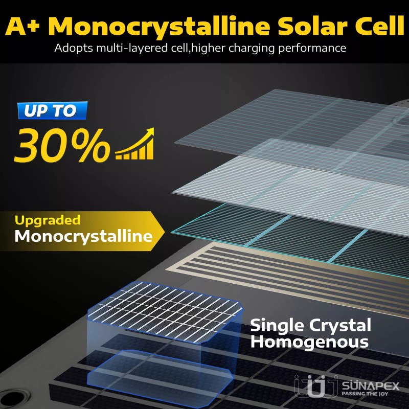 - High-efficiency Solar Panel: Our solar panel features monocrystalline cells. Compared to other polycrystalline and amorphous solar panels of the same size, our monocrystalline solar panel charges faster