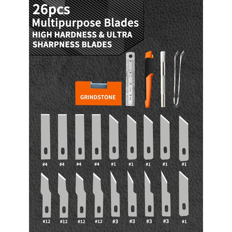 - 📋VERSATILE TOOLS: This set includes 26 different blades, allowing you to create a wide variety of intricate designs. Additionally, it comes with 2 carving knife replacement pens, tweezers, a steel ruler for accurate measurements, and a sharpening stone to keep your blades in top condition.