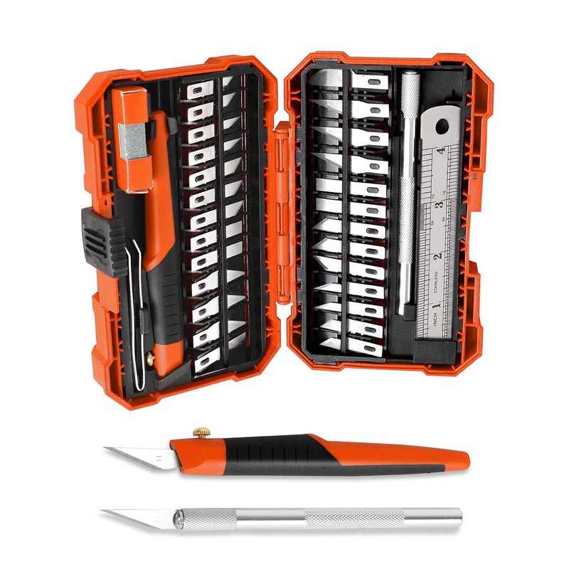 - ⚙️EASY TO USE: The ergonomic design of the knives and pens ensures a comfortable grip, making it easy to handle and control. The included steel ruler helps you achieve precise cuts and measurements.