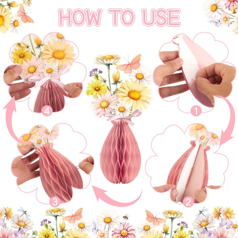 - 9 PCS Daisy Honeycomb Centerpieces:You will get 9 pieces of lovely daisy table honeycomb centrepieces; the delicate design and right size make these daisy party decorations perfect for adding a natural and cheerful atmosphere to your table at any event or celebration.