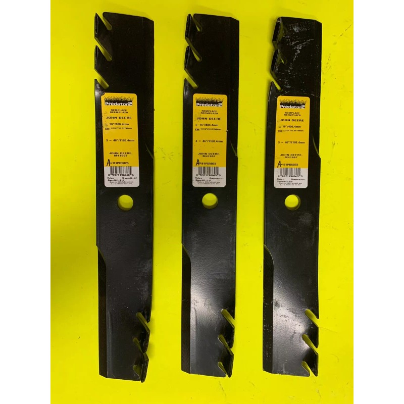 A great deal on a set of 3 Sunbelt "Predator" mulching blades for John Deere 46 inch mowers also know as "Model 48" mowers as described below! These are excellent replacements for the standard mower blades. (John Deere part number M41967) These brand new blades have never been installed and are guaranteed to fit all models 120, 140, 300, 312, 314, 316, 317 when equipped with 46" mower decks.