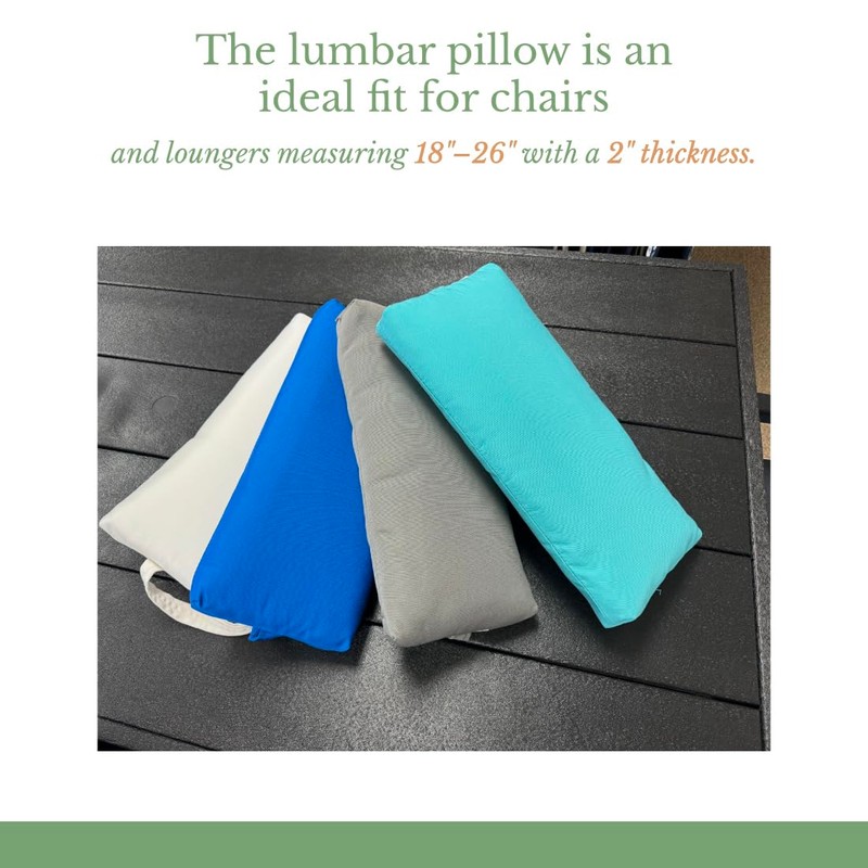 Headrest / Lumbar Pillow with velcro straps. Great for use on patio chaise lounges and Ledge Lounger pool furniture. Made from Sunbrella brand fabric with quick dry polyester fiber fill. Pillow measures 18" x 8" 3" Thickness Straps are each 19" long with 10" velcro per strap. Ideal fit for chair/ lounge widths measuring 18"-26" that are 2" thick