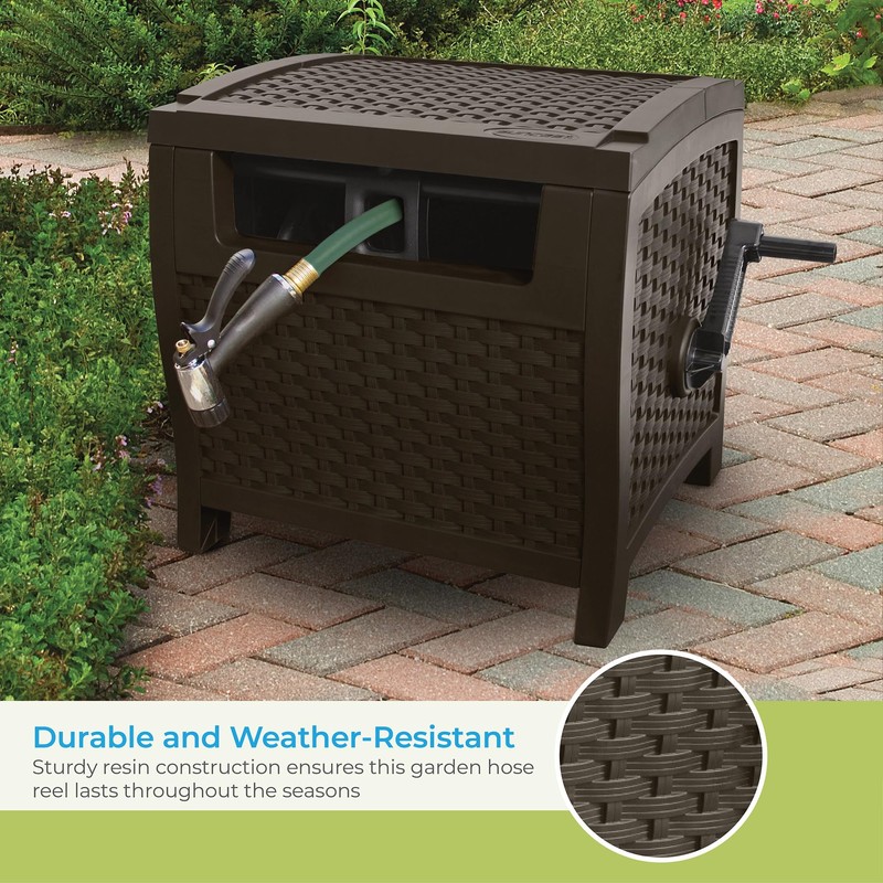 - OUTDOOR GARDEN HOSE REEL: Features a wicker style java exterior for a stylish and functional addition to your yard