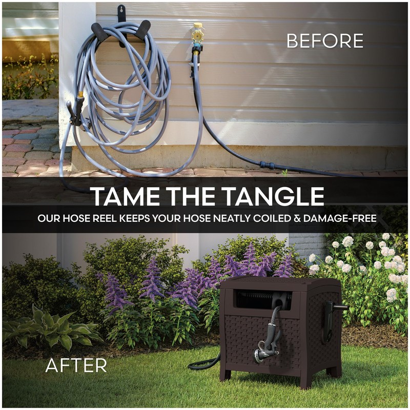 • OUTDOOR GARDEN HOSE REEL: Features a wicker style mocha exterior for a stylish and functional addition to your yard