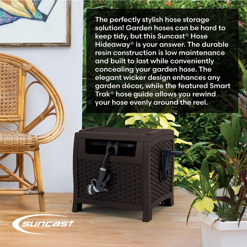 Keep your home's outdoor area organized and clutter-free with the Suncast 225 ft. Wicker Style Resin Hose Hideaway. With a wicker style mocha exterior, this hose reel provides a natural accent to your home's outdoor space while also bringing you a convenient way to store your garden hose. This hose reel features a strong, reinforced system to ensure a watertight connection and easy storage of up to 225 feet of 5/8" Standard vinyl garden hose. The smart trak hose guide built into this hose cart makes winding and unwinding your hose a breeze. This hose reel also features sturdy resin construction that makes it resistant to fading, durable, and easy to maintain. The Suncast 225 ft. Wicker Style Resin Hose Hideaway measures 21" x 22" x 21.5" to keep your yard organized without taking up too much space. Suncast takes pride in helping customers enhance their indoor and outdoor spaces with quality products that are stylishly designed. You take pride in creating a beautiful environment. We take pride in keeping it that way.