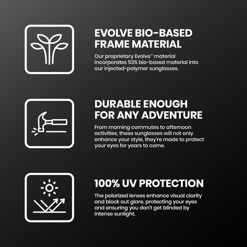 - EVOLVE ECO-MATERIAL: Our proprietary Evolve material incorporates 53% bio-based material into our injected-polymer sunglasses.