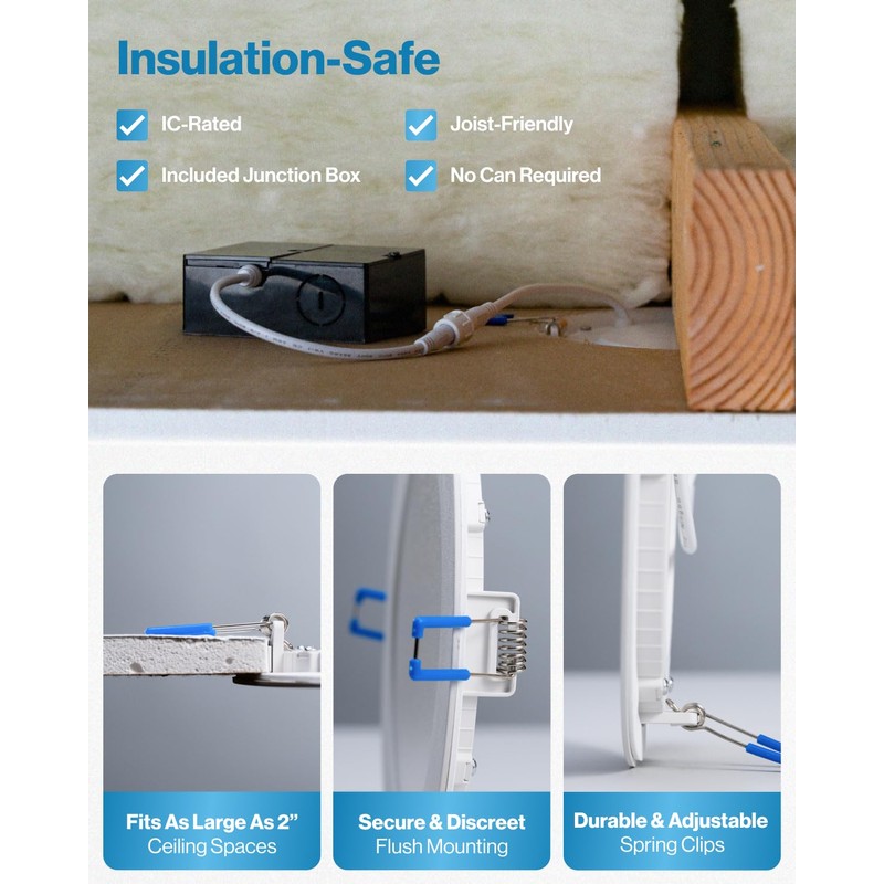 • ✅ SIMPLE INSTALL - Our LED slim downlights come equipped with a junction box which means they do not need a can. This 4-inch Wafer Thin Slim installs fast. Cut a hole in the ceiling to size then fold the spring-loaded brackets in while pushing up into the hole. Spring-loaded brackets fit any ceiling type: double drywall, single drywall, and soffit.