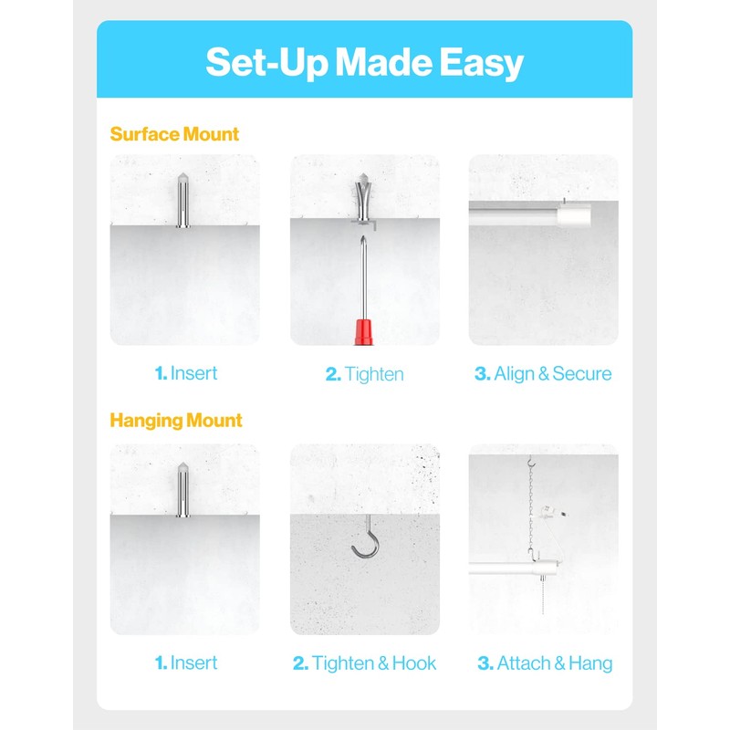 - ✅ SIMPLE INSTALL - Follow our installation guide for quick and easy setup, mounting hardware included (5' cord, 10" pull chain switch). Directly plug and play to your ceiling or suspend from the included hanging chains for bright light in garages, basements, warehouses, and storage areas.