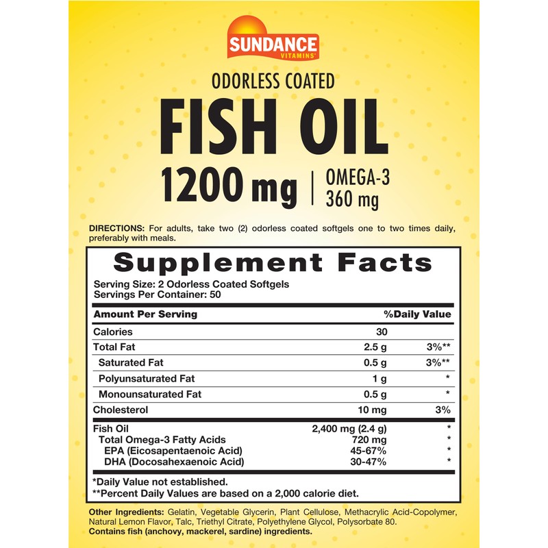 Sundance Odorless Fish Oil 1200mg | 100 Coated Softgels | Controls Fish Burps | Lemon Flavor | Non-GMO and Gluten Free Supplement.