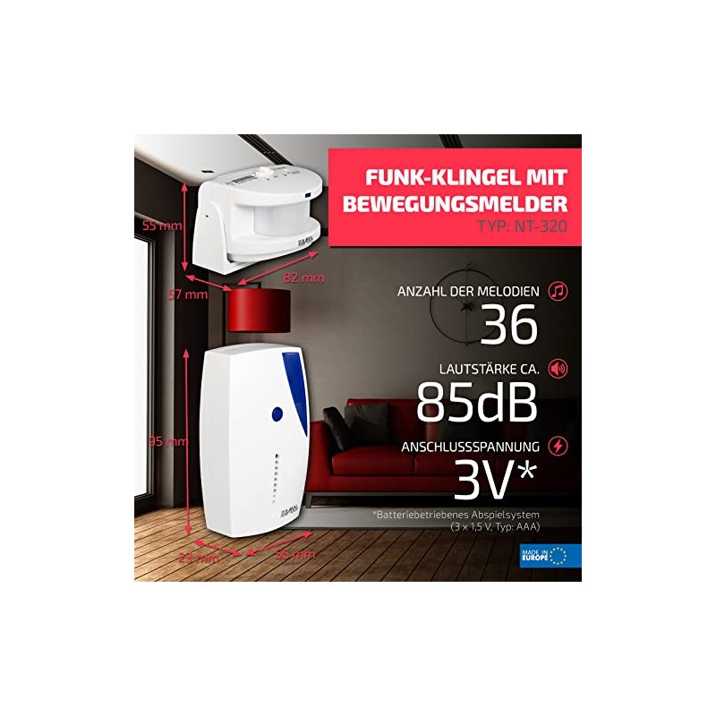 - Ideal as a notification device when a person enters a certain room in homes, shops, hotel receptions, warehouses, etc.