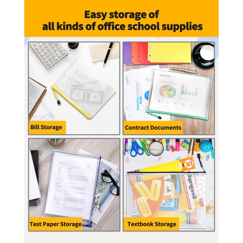 SUNEE Bolsa de malla de plástico con cierre de 9 x 13 pulgadas (6 colores, 12 paquetes), bolsa extragrande resistente al agua con cierre para suministros de oficina escolares, rompecabezas y juegos organizando almacenamiento