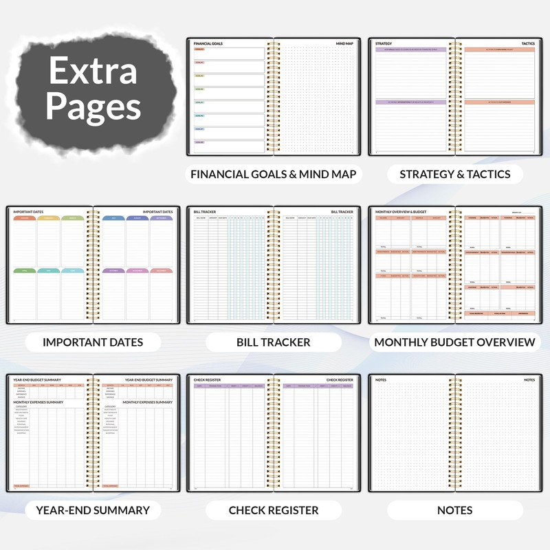 - UNDATED DESIGN & 1 YEAR USE - Undated finance books start with 1 page-financial goals, 1 page-Mind Map, 1 page-Financial Strategy, 1 page-Tactics, 2 pages-Important Dates, 4 pages-Bill Tracker, 4 pages-Saving Tracker, 8 pages-Debt Tracker, followed by 12 Months(10 pages per month, 1 unique color for each month). 2 pages-Christmas Budgeting, 2 pages-Yearly Summary, 2 pages-Check Register and 12 pages-Notes(dotted). It is UNDATED, so you could start at any time, suitable for 1 year use.