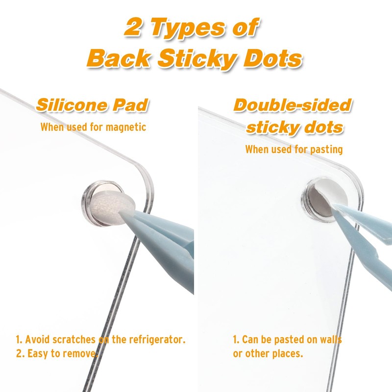 - Strong Magnetic and Pastable: The acrylic photo frame can be magnetic or pasted. 4 pairs of strong magnets securely hold 2 clear acrylic blocks and the photo. They can firmly attach the photo to the refrigerator or any metal surface without falling off. Stick the attached silicone pad onto the magnet to avoid scratches on the refrigerator. The double-sided sticky dots can firmly stick the photo frame to any surface such as walls or wooden boards without falling off. There are sufficient quantities of silicone pads and double-sided sticky dots that can be replaced.