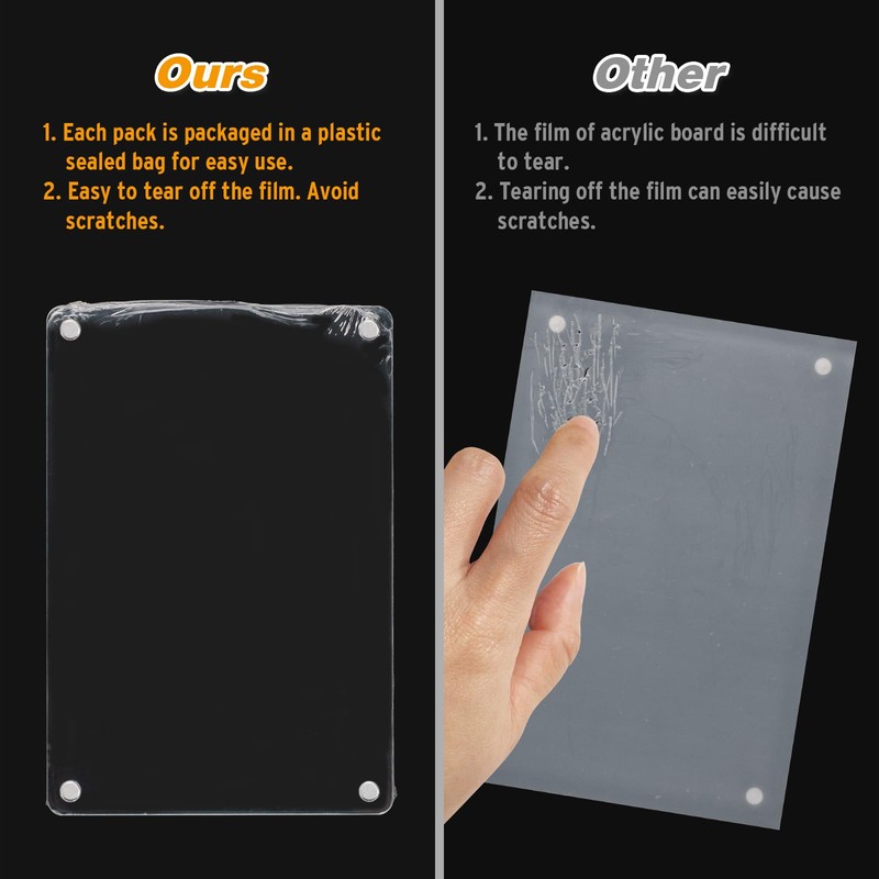 - Protective Packaging and Easy to Use: Simply and slightly slide the frames apart to put or change your photo. Each set is individually wrapped with shrink film, which protects the acrylic frame and makes the packaging easy to tear off. Our packaging can avoid scratches when torn, and our packaging is easier to tear than the film adhered to acrylic. This will save a lot of time.