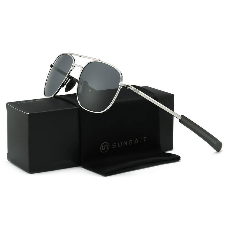 SUNGAIT Men's Military Style Polarized Pilot Aviator Sunglasses - Bayonet Temples (Silver Frame/Gray Lens, 55) A285YKHU