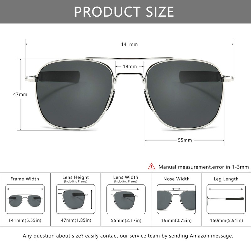 - Sunglasses Dimensions: Lens Height: 47mm/1.85inch; Lens Width: 55mm/2.17inch; Nose Bridge: 19mm/0.75inch; Arm: 150mm/5.91inch; Frame Length: 141mm/5.55inch
